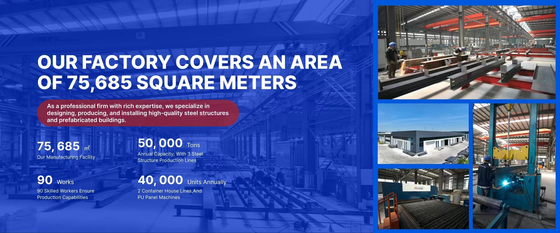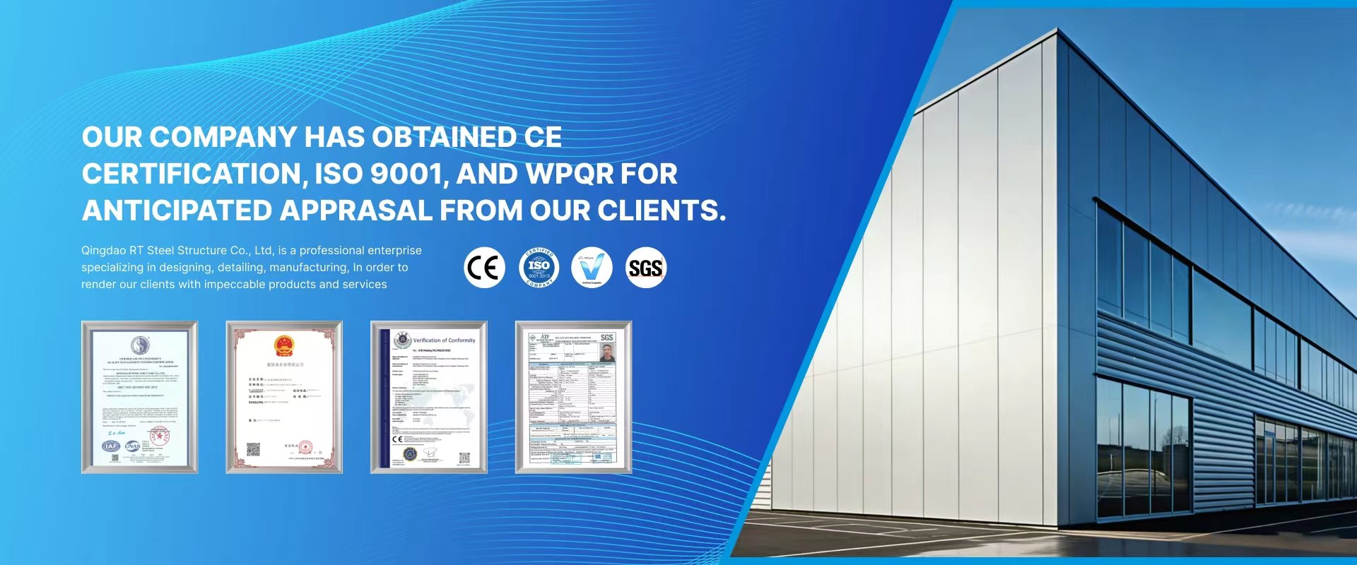 Qingdao RT Steel Structure Co., Ltd. and Shandong Lanjing Steel Structure Co., Ltd., both are owned by Mr. Xing Huaigao. Our office located in Qingdao and factory in Weifang. As a professional company with rich expertise, we specialize in designing, producing, and installing all kinds of high - quality prefabricated steel structure buildings. Our 75, 685- square- meter facility, employing 90 skilled workers, ensures robust production capabilities. We utilize advanced machinery: laser cutters for precision, assembly/ straightening machines, flame cutters, gantry submerged arc welders, container house frame formers, high- tech paint coating lines, and PU panel machines. With 3 steel structure production lines ( 50, 000 tons annual capacity), 2