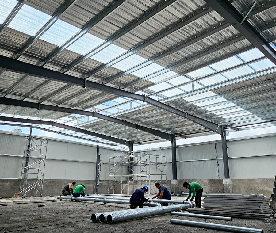 First, steel components are prepared with precision. These prefabricated steel parts are then transported to the site for installation and assembly. Workers meticulously connect steel beams and columns, gradually forming the robust framework of the factory. The installation of the roof, with its translucent panels, allows natural light to flood the interior, as seen in the progress of the construction.