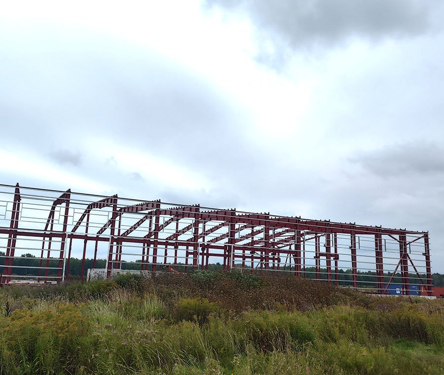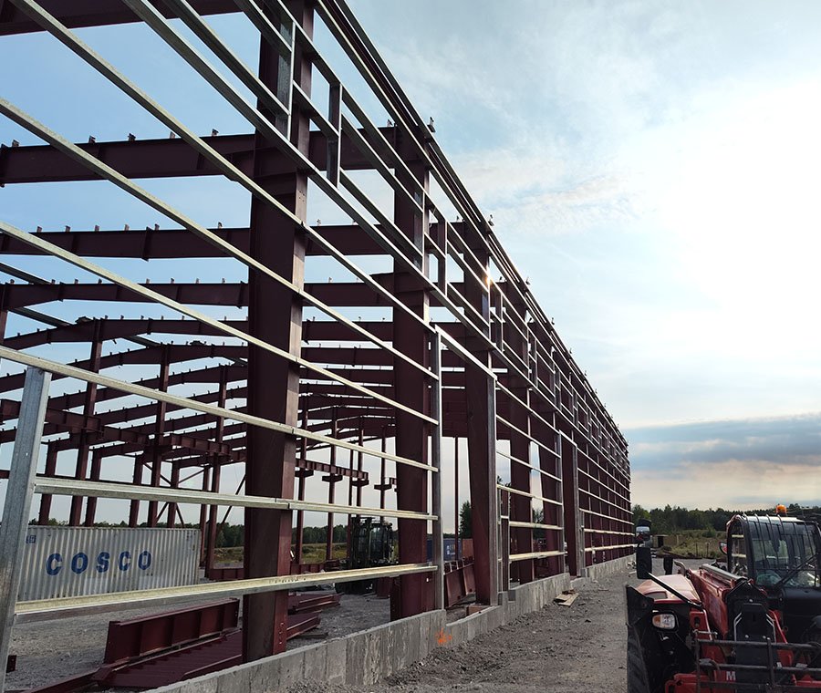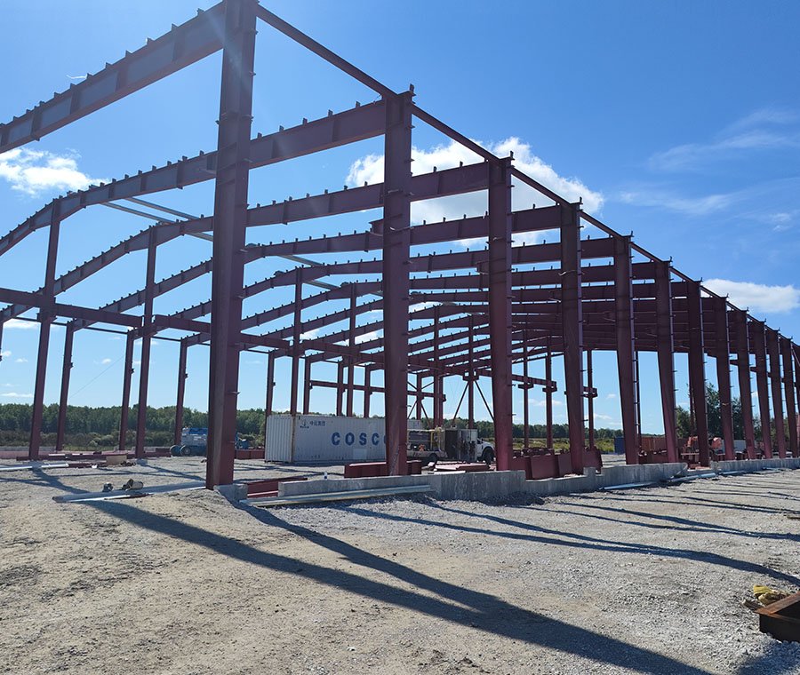 Within a few days, the "skeleton" of the steel structure building becomes clear. Rows of steel columns stand tall, and steel beams crisscross and grow section by section. Silver enclosure components begin to attach to it, and the outline of the building becomes increasingly full. The appearance of the factory building emerges. The surrounding woods, containers, and gravel on the ground, with the COSCO container standing quietly, and the building materials scattered on the gravel ground and the busy engineering vehicles form an interesting contrast. From scattered steel parts to a (taking shape) factory frame, the red steel structure quickly outlines the solid appearance of industrial architecture.