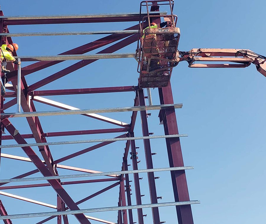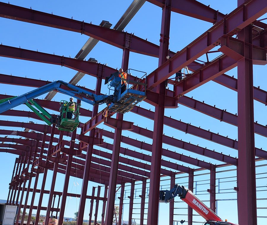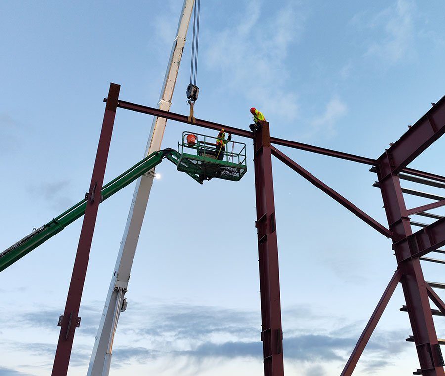 On September 17, 2022, at the red steel construction site. The long arm of the crane accurately delivers the red steel components to the high altitude. Workers skillfully connect the steel frames in the aerial lift. Welding sparks flash, leaving a solid mark on the red steel bones.