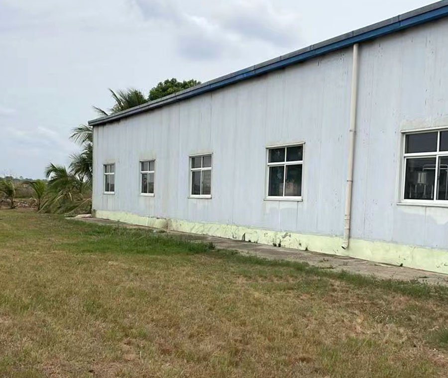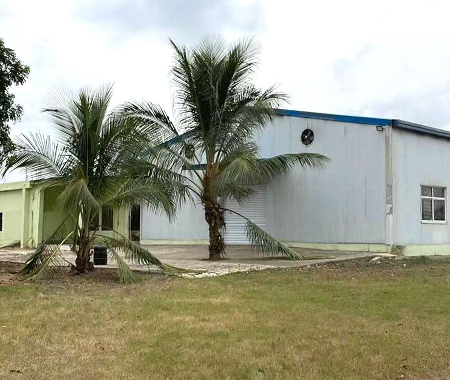 A steel-structured factory building in Togo, with dimensions of 50m×25m×4m. The building features a light gray steel exterior wall and a blue roof, equipped with multiple windows for natural lighting. Surrounded by grassy fields and palm trees, it blends into the local landscape. Such steel-framed structures are renowned for their durability and quick construction, making them ideal for industrial use in Togo. The facility, with its functional design and robust build, is well-suited to support local manufacturing or storage needs.