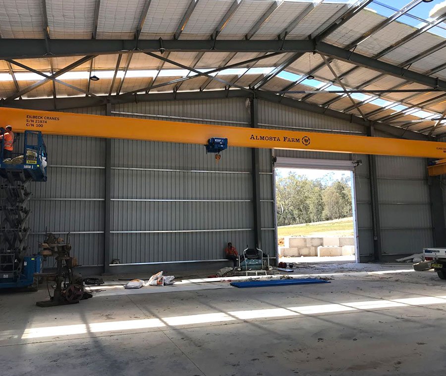 The process begins with erecting steel columns on concrete bases . Next, the steel roof framework is assembled, creating the building’s skeleton. Inside the completed structure, a large overhead crane marked “Almosta Farm” is installed, highlighting its industrial functionality. This structure project shows the strength, efficiency, and versatility of steel construction for warehouse facilities.