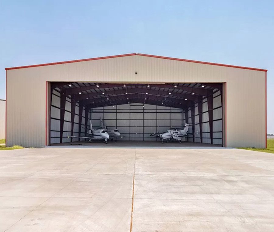 Steel structure hangar has features of high fire resistance, strong corrosion resistance. Steel structure hangar is mainly refers to the main bearing component is composed of steel. Including the steel columns, steel beam, steel structure, steel roof truss. Each component using welds, bolts or rivets to connect. The roof and wall can be made of composite panel or veneer. Galvanized sheet metal can prevent rust and corrosion. The use of self-tapping screw can make the connection between the plates more closely, to prevent leakage. You can also use composite panel for roof and wall. The sandwich is polystyrene, glass fiber, rock wool, polyurethane. They have good thermal insulation, heat insulation, fire-retardant. The wall of the steel structure maintenance also can use brick wall. The cost of a brick wall is higher than galvanized steel roof and wall. The usage scale includes large-scale workshop, or warehouse, supermarkets, entertainment centers and modular steel structure garage.