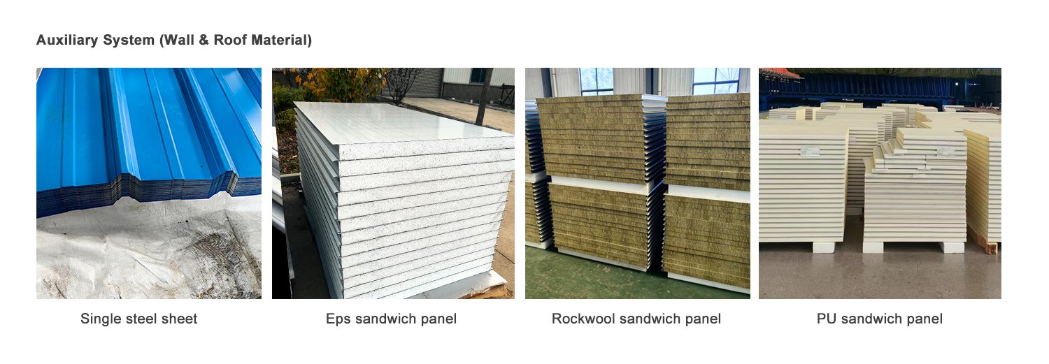 It use H steel as column and beam, supporting by C/Z purlins, tie rod, X brace etc, and wall and roof are covering by color steel sheet or Insulated sandwich panel PU/ EPS/ Rockwool. Fiberglass. It has the advantage of shorter building time, eco-friendly and modern design, lower investment etc comparing with traditional concrete building.